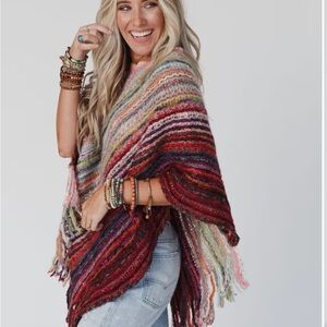 Brand new!! Vibrant multicolor striped knit poncho with fringe detail. Perfect for layering. One size. Super adorable with anything!