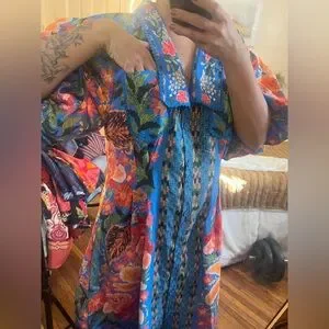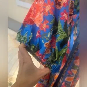 Stunning FARM Rio maxi dress. Features vibrant floral patterns. Bold blue and orange hues. Perfect for any occasion.