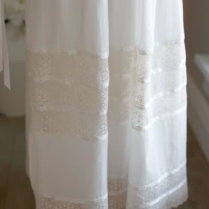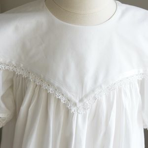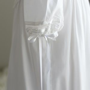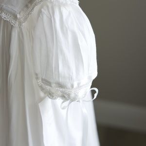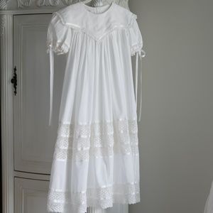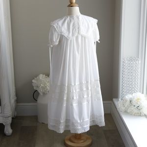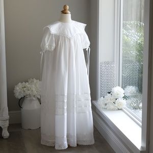 This ORIGINAL Strasburg Heirloom Bella Collection Vintage White dress is breath-taking! No longer in production. Lace and collar are different on recent productions. This full length white cotton float dress has white cotton crocheted lace & white satin ribbons at the collar, sleeves and inserted on the skirt. The sleeves have three layers of satin ribbon and three layers of crocheted lace, with the last layer of ribbon gathering the sleeves and tying into a bow. The entire oversized collar is outlined with white satin ribbon and finishing off with a crocheted lace. The skirt has three layers of crocheted lace bordered with white satin ribbon (mid skirt) and the bottom hem has two layers of crocheted lace, both bordered with white satin ribbon. Upper back button closure. HAS MATCHING SLIP! One of Strasburg's most elegant styles. Heirloom quality to pass to future generations. Perfect for flower girls, portraits or any special occasion. Gorgeous!! Worn once and professionally laundered. Perfect Condition-like New!