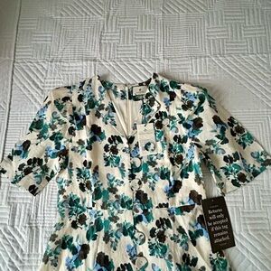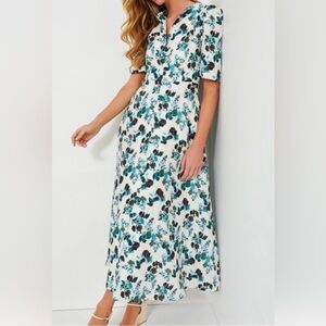Chic New with tag Tuckernuck Linen Blue Blooms Floral Garden Midi Dress. Size Medium. Features short sleeves and flowing silhouette. Button Front, Back Zip Closure. V-Neck. Side pockets. Ideal for casual outings.