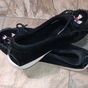 Elegant Minnetonka black suede moccasins with intricate beaded accents. Ideal for everyday comfort. Size 11. Runs a little small. More like a 10 or 10.5. In good condition.