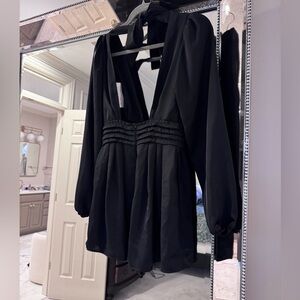 Chic black romper with long sleeves. Deep V-neckline. Perfect for stylish outings.