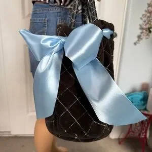 This started as a bag that needed major rehab so before you hate it hear me out. It was a really fun project for me to be creative with a design I love…. so if you love it or hate it, it was a labor of love to bring it to this point. I had a Cinderella vision, the videos of the rehab are on Tik tok under juicycoutureheiress. I removed the pockets they were a mess, the inside is fairly clean with a tiny hole. The outside stitching had stains so I changed the color to blue to cover the stains, the classic daydreamer scarf was missing so I replaced it with a double satin bow. I think it’s adorable but like most collectors I would have loved this all original but it was beyond saving. The bow edges are rough cut and may need the edges glued. There is a yellow spot I couldn’t remove at the top left of the design. See photos and zoom in for accurate condition.