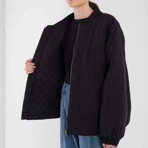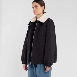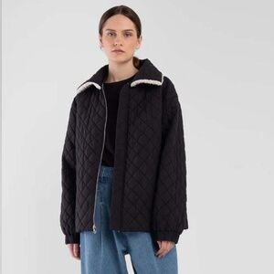 Reversible, relaxed fit jacket with quilted detail on one side and padded detail on the other side. The jacket features a patch pocket with welt, a detachable sherpa collar, a bomber style knit trim collar and elastic gathering at sleeve hem. The sherpa collar is detachable and reversible with quilting on the other side. 5 ways to wear. NWOT