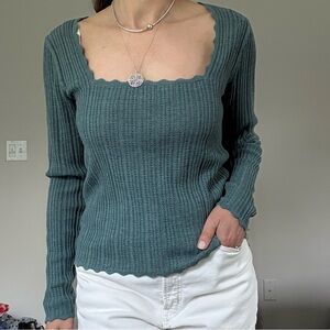 J. Crew Scalloped- Edge Pointelle Green Wool Sweater. Square neckline. Size medium. Teal color. Excellent condition.