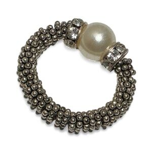 This elegant ring features a stunning pearl centerpiece surrounded by sparkling crystals. The intricate beaded band adds a touch of sophistication. Perfect for any occasion.
