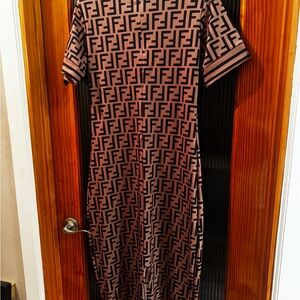 Elevate your style with this chic designer dress. Featuring a striking black and brown pattern, this dress is perfect for any occasion. Enjoy the comfort and elegance of this must-have piece.