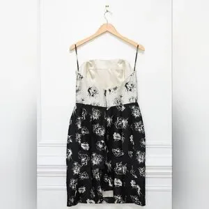 Lela Rose Floral Strapless Silk Cocktail Dress Black Silver Metallic Formal Sz 8