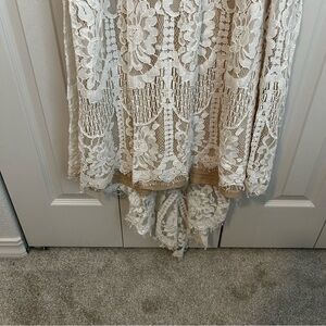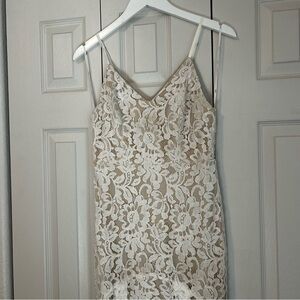 Chic cream lace dress with a mermaid hem. Perfect for elegant occasions. Features delicate lace and a flattering silhouette.