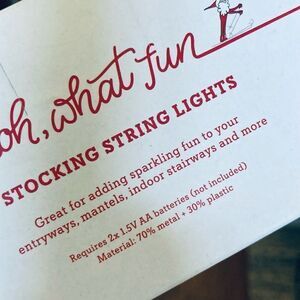 NWT red metal Christmas holiday stocking mini string lights. Requires 2 AA batteries (not included). Over 5’ length, 10 lights.