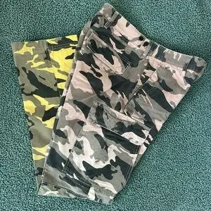Chic pink and black camouflage cargo pants. Features multiple pockets. Perfect for casual wear. Pink then fades to yellow at bottom. NWOT. One small hole(pictures) in right back. Unnoticeable unless pointed out. Fits like a size small/4.