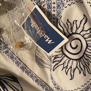 NWT calypso blue and white beach themed size small dress. Has pockets! Extra button attached for cuff if needed. 15.5 inches waist lying flat. 18.5 inch pit to pit lying flat. 36 inches long.