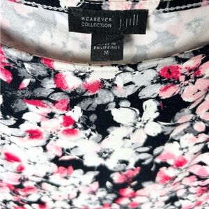 The J. Jill Wearever Collection Floral Dress in size M is a versatile and comfortable option for various occasions such as travel, parties, casual outings, or even office wear. This sleeveless dress features a round neckline, a pullover closure, and pleated accents. Made from a blend of spandex and rayon, the knee-length dress offers a stretchy and comfortable fit, perfect for all-day wear. The floral pattern in black, white, pink, and gray colors adds a touch of elegance and style to this classic and business-casual themed dress.