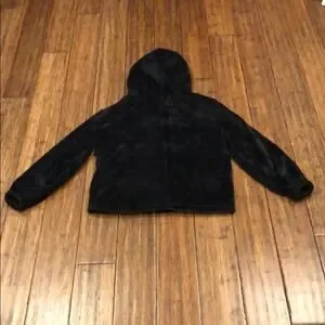 Long sleeve soft black fleece hooded jacket with zip closure and two front pockets. 95% polyester, 5% spandex. Lining 65% rayon, 35% spandex.