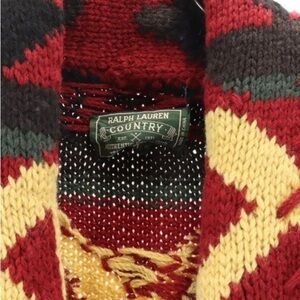 Bold Ralph Lauren cardigan. Features red, yellow, green, and blue geometric patterns. Cozy and stylish.