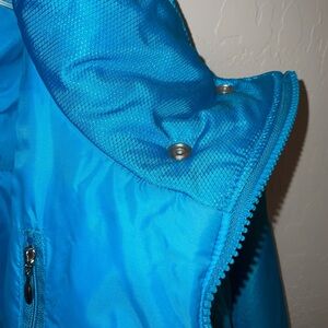 This is gorgeous!! Great turquoise color! Full zip with snaps at bottom and neck. Zippered exterior pockets and one zippered interior pocket. Removable shoulder pads.