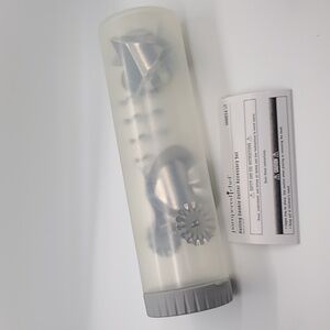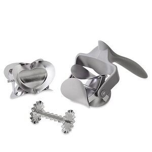 Create fun cookie shapes with this Pampered Chef set. Includes various stainless steel cutters and a rolling tool. Ideal for baking enthusiasts.