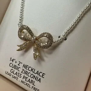 Camila Coelho Silver Cubic Zirconia Bow Necklace on strand of small faux pearls