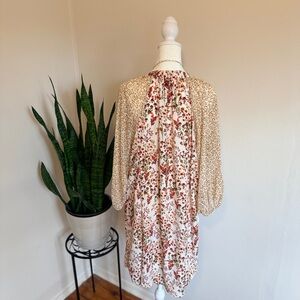 Beautiful boho long sleeve dress with floral pattern from Umgee. Features gold lurex threading mixed with cream, brown, red-orange hues. Lightweight sheer fabric with slip dress underneath. Perfect for fall with short or tall boots.