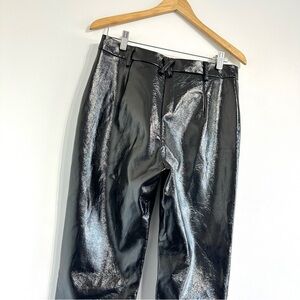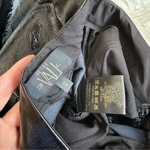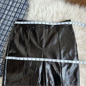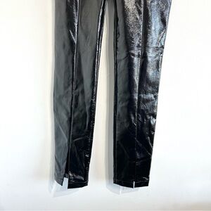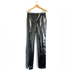 Sleek and shiny black pants from de la vali. Perfect for a bold look. Slim straight leg with slit at hem. High rise. Faux patent leather look. Zip and hook and eye closure. Great preowned condition.