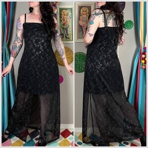 Vintage Y2K Black and Silver Glitter Sheer Mesh Slip Dress