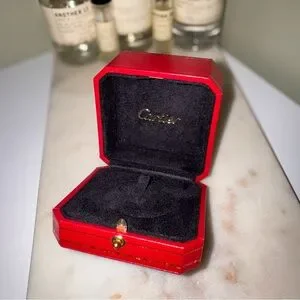 Luxurious Cartier box in vibrant red with a sleek black interior. Perfect for showcasing jewelry.