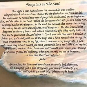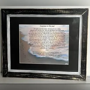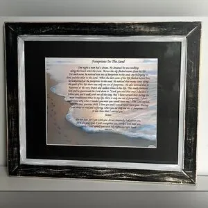 This is a framed artwork of the famous “footprints in the Sand” poem and also has a scripture Isaiah 41:10. I purchased this art new and sanded the black frame for a rustic appearance. It’s in excellent condition.