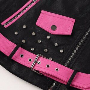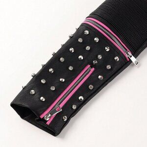 Pink Casual Women's Faux Leather Biker Jacket with Diamond Studs