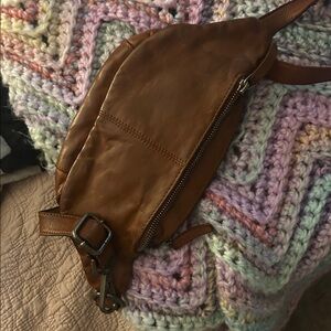 Stylish brown crossbody bag with a woven front pocket. Perfect for everyday use.