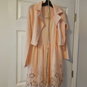 Chic pink textured jacket paired with a matching dress. Features delicate lace details. Peach/Silver set worn once by my granddaughter. The dress is sleeveless.