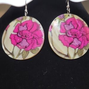 These are so fun! Pink and purple floral design on shell. For pierced ears, hooks.