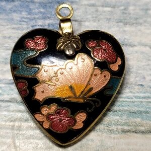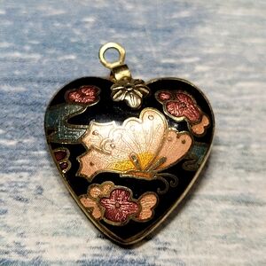 Vintage Cloisonne Butterflie Heart Pendant Necklace.