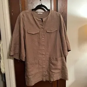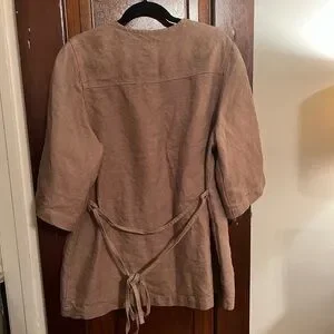From website: This belted linen overshirt uses 100% natural heavy linen. It features a straight, relaxed silhouette, wide half sleeves, front patch pockets, and a snap-button closure. The matching linen belt lets you adjust the fit, and the mid-length cut gives full coverage. The piece feels lightweight yet structured, perfect for warmer seasons.