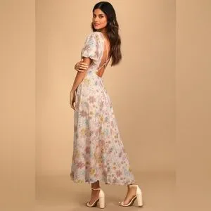 Let your love for the Lulus Flourishing Feelings Pink Floral Print Puff Sleeve Midi Dress bloom each time you wear it! Lightweight woven fabric, with a vintage-inspired floral print, shapes this dress that has a surplice neckline, fitted bodice, and puffy short sleeves. A high waist tops a seamed midi skirt with hidden side seam pockets. The open back is accented with two crisscrossing adjustable straps. Hidden back zipper/clasp.