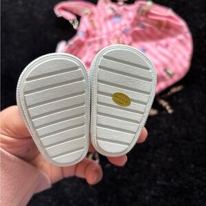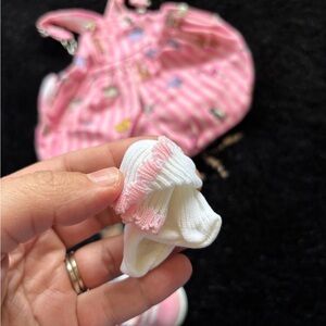 Pink striped baby overalls with animal prints. Comes with matching pink shoes. American Girl/ Pleasant Company. Used to be my sister’s!