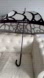 Black nylon Chanel Rue Cambon umbrella with sketch pattern motif throughout, wrapping snap-closure at exterior, black metal vanes and brand signature interlocking CC and rose motif at handle.