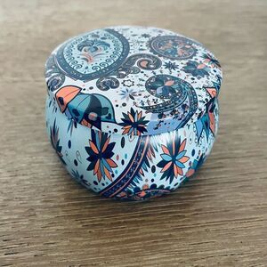Small metal trinket lidded storage jar with blue floral paisley print. Can be used for small items, jewelry, etc. Like new condition.