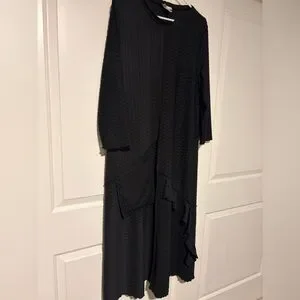 Elegant black textured dress with long sleeves. Features a unique design with ruffle details.