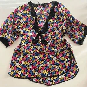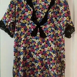 Christian Dior lingerie slip top with vibrant floral print. Features elegant black lace accents. High slits on sides. Deep v. Vintage from 70’s.
