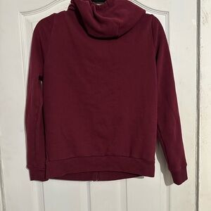 Soft burgundy hoodie with black details. Features a zipper and drawstrings.