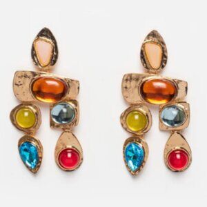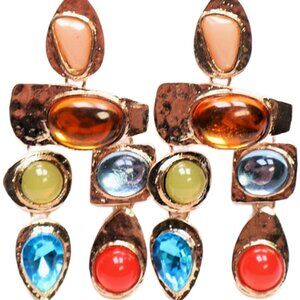 Elevate any outfit with these stunning PETIT MOMENTS multicolored dangle statement earrings. Crafted from gold-tone metal with a distinctive hammered finish, these eye-catching drop earrings feature a vibrant mix of faceted crystals and smooth resin cabochon stones in rich hues orange, yellow and blue.