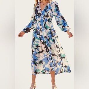 Floral Blue, Green, & White Long Sleeve Midi Dress NWT Sz XL Bust 47” Retails$69