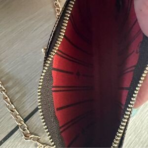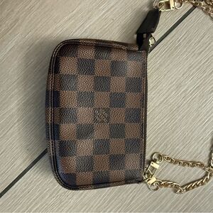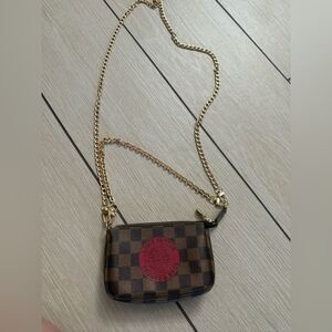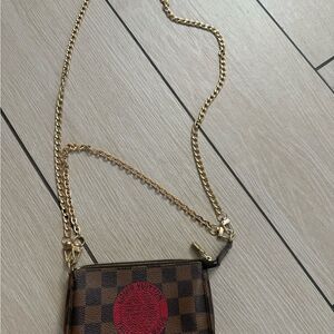 Used in excellent condition Louis Vuitton limited edition Damier Pochette Elevate your style with this chic designer checkered mini crossbody bag. Featuring a striking brown and red color combination, this bag is perfect for any occasion. The elegant design and premium materials make it a must-have accessory. Original bag the chains are after market