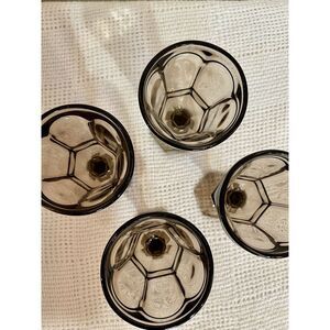 This is a set of four vintage wine glasses from Fostoria's Virginia product line, manufactured in America in 1978. The glasses are round and paneled with a tawny brown color and glossy finish. They stand 6 inches tall and are made of hand-blown glass. The glasses are unmarked and do not come with a lid. They are recommended to be hand washed and are suitable for all occasions. The glasses are a vintage luxury item and would make an elegant addition to any drinkware collection.
