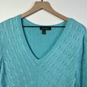 Keywords: Lauren Ralph Lauren, cable knit sweater, V-neck sweater, aqua blue sweater, long sleeve sweater, womens sweater, silk blend sweater, classic sweater, casual sweater, preppy style, knitwear, light blue sweater