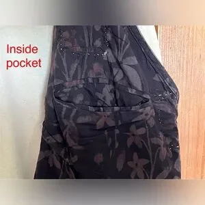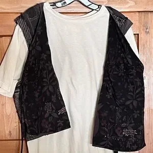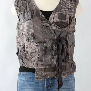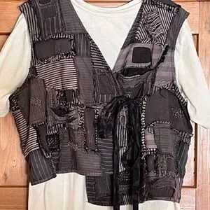 Darling Magnolia Pearl patchwork vest. Inside is lined with black/gray print featuring adorable bunny and inside breast pocket (could be reversible). Asymmetrical hem, with long ties on outside. Magnolia Pearl patch/appliqué logo on inside and right side. (T-shirt not included-for contrast)