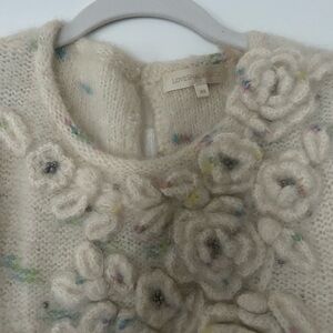 Stay cozy and stylish with this sweater with rainbow confetti motif and floral rosette appliqués Perfect for any casual outing. In excellent used condition with no pilling, stains, or other signs of wear.