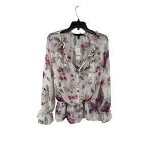Brand new and beautiful! This White House Black Market blouse features a soft ecru base with violet floral print, accented by ruffled trim, covered buttons, and a flattering tie waist. Includes a matching cami tank, making it a complete and polished outfit piece.