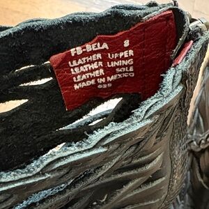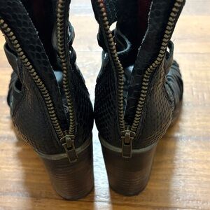 Stylish pre-owned leather Freebird by Steven Bela black multi woven peep toe booties with a chunky heel. Made in Mexico, heel is a wood hue and the bottom sole is red. Back ankle zippers work well, please see pictures for overall condition.