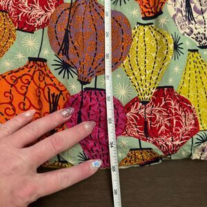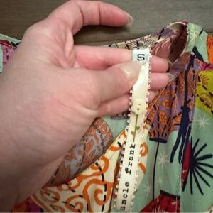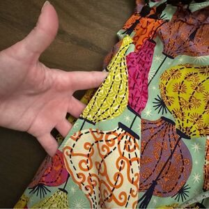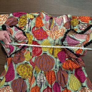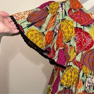 Uncle Frank Chinese Lantern Print Multicolor Short Sleeve Rayon Mini Swing Dress. Pullover style with keyhole button at back of neck. Round neck with short flutter sleeves with a black dot trim. Seafoam green with fuchsia pink, purple, chartreuse, orange lantern pattern all over. There is round seaming around the bust so it has a subtle full/flare for the skirt of the dress. Such a fun and unique dress with a retro/vintage vibe!